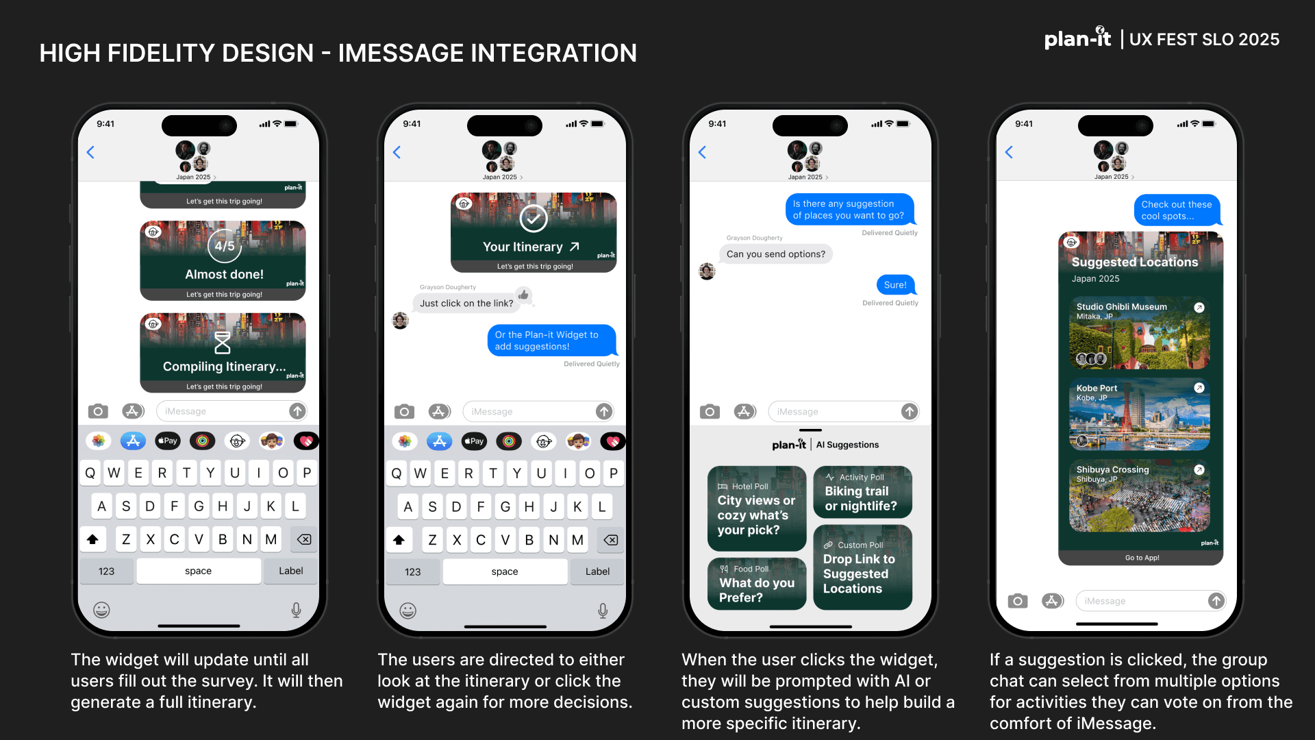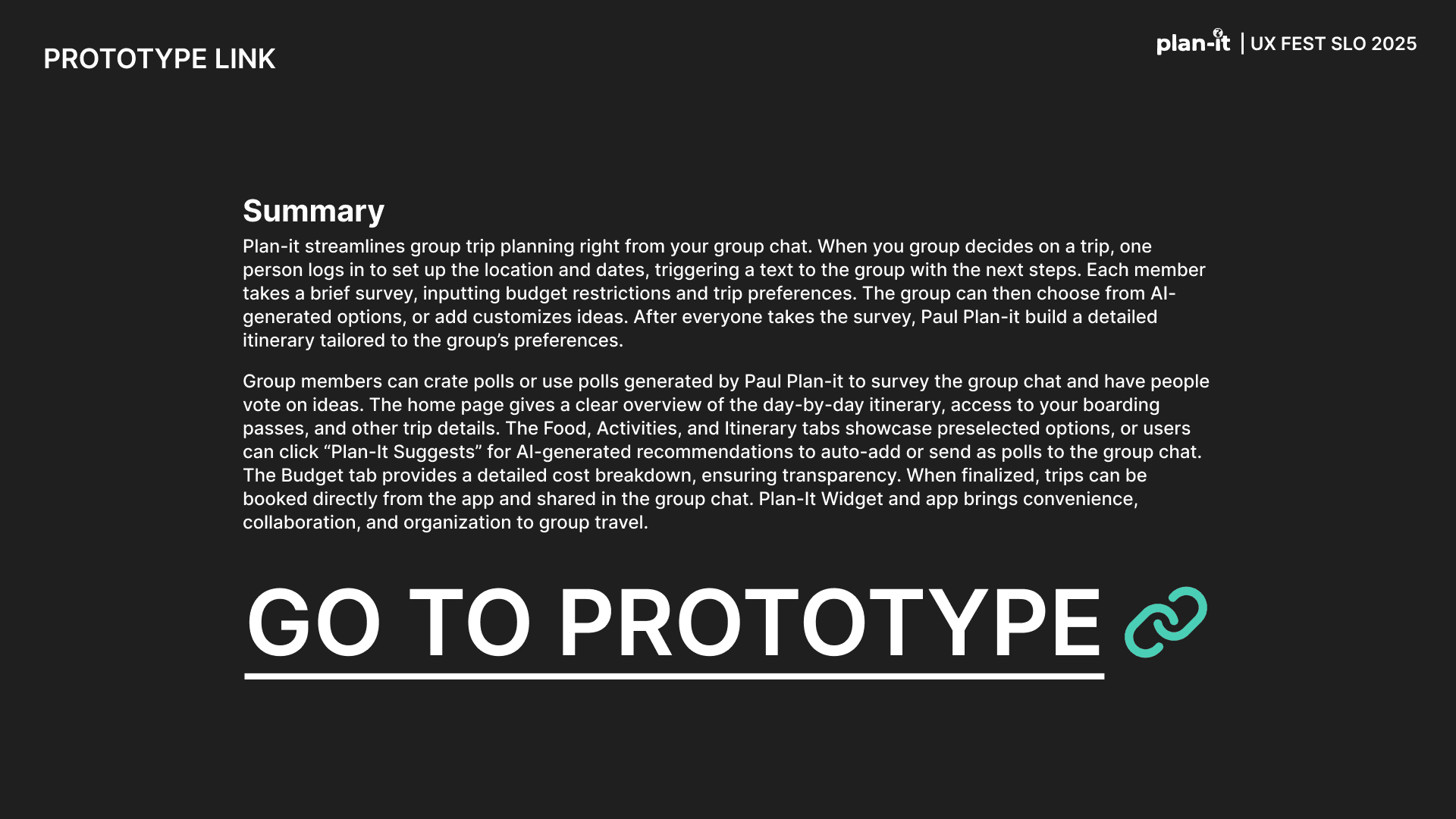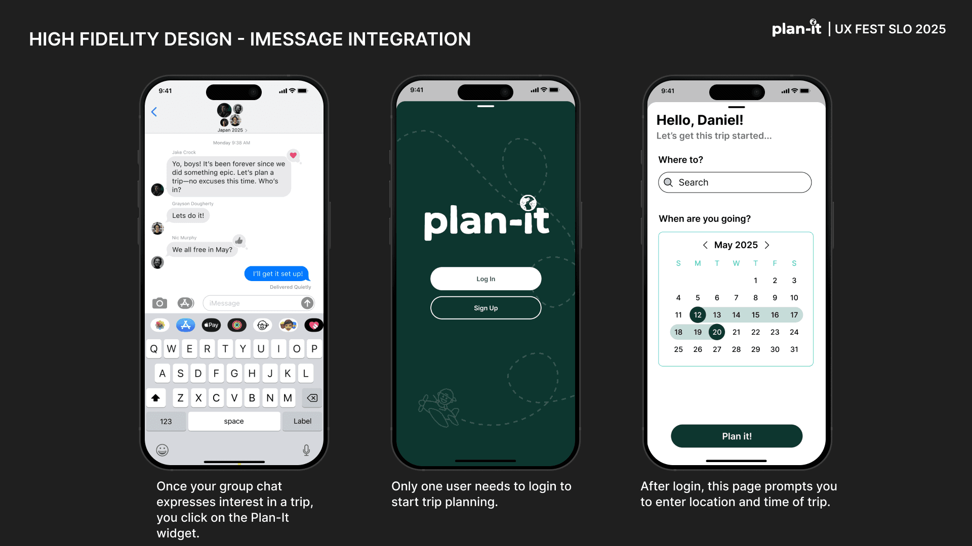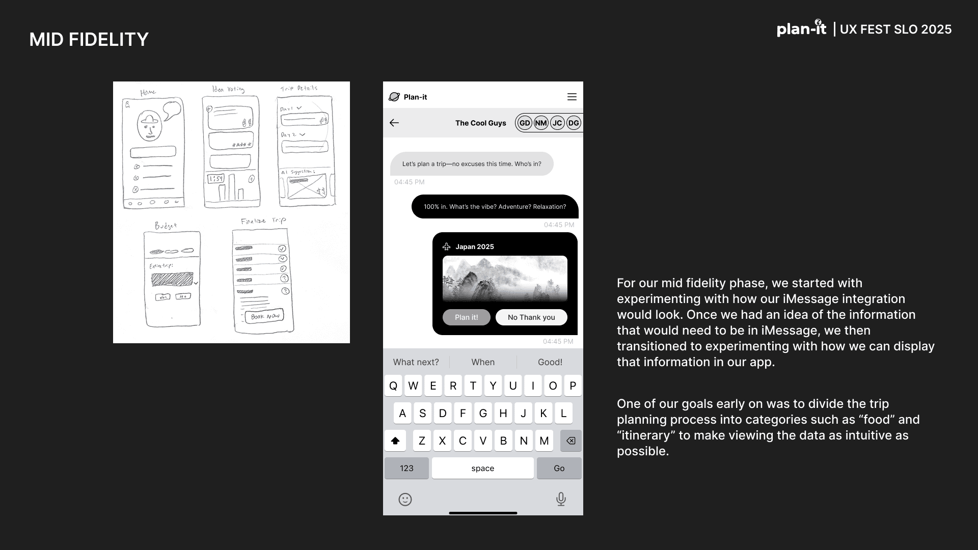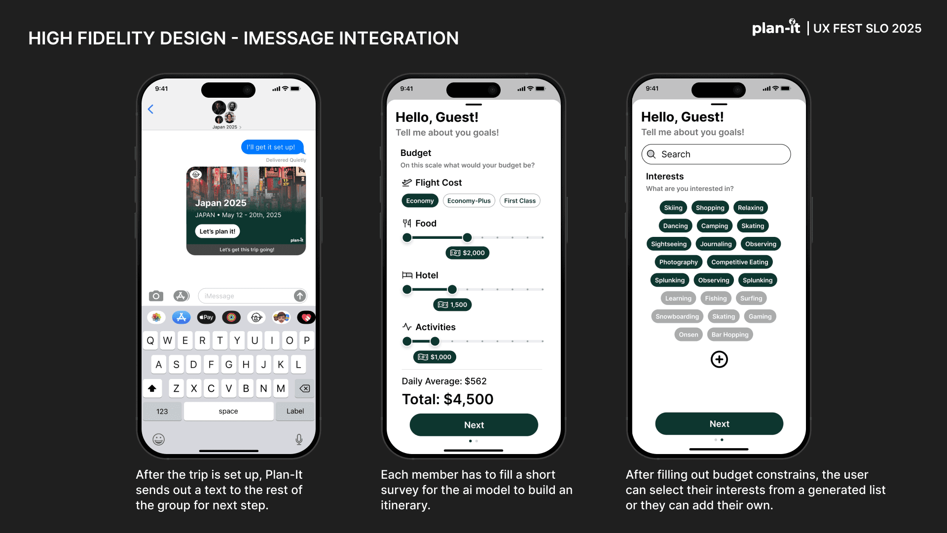 Plan-it is an original app created as part of the UX-Fest SLO 24-hour design competition, and won 2nd place out of 40+ competing teams. The prompt was to incorporate AI in an app that would help users travel from A to B. Plan-it helps groups execute travel plans in a low stress environment, embedded into iMessage.