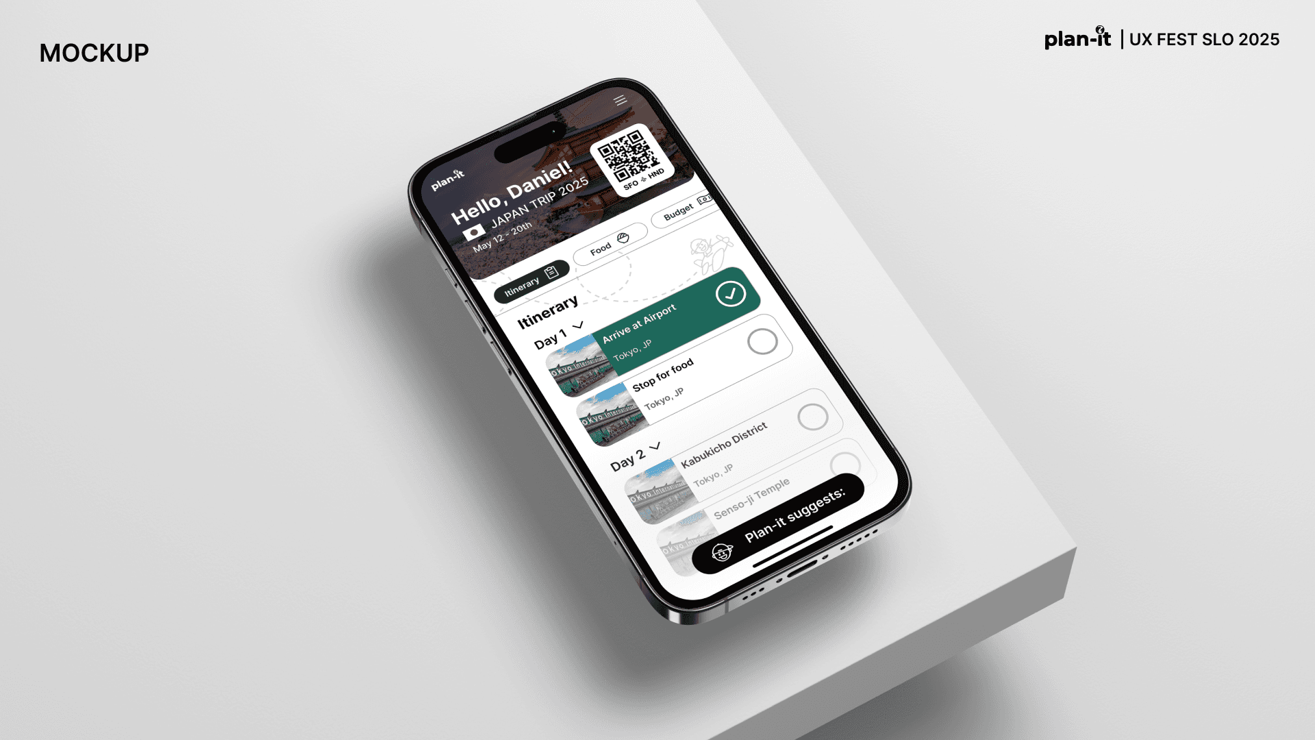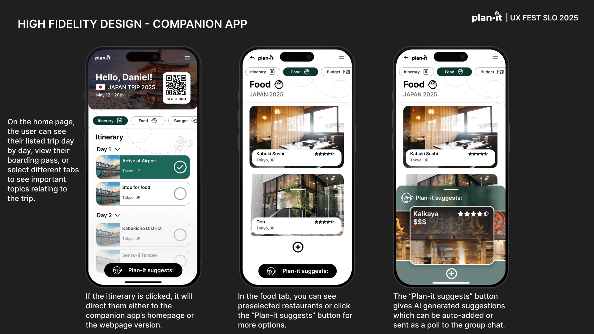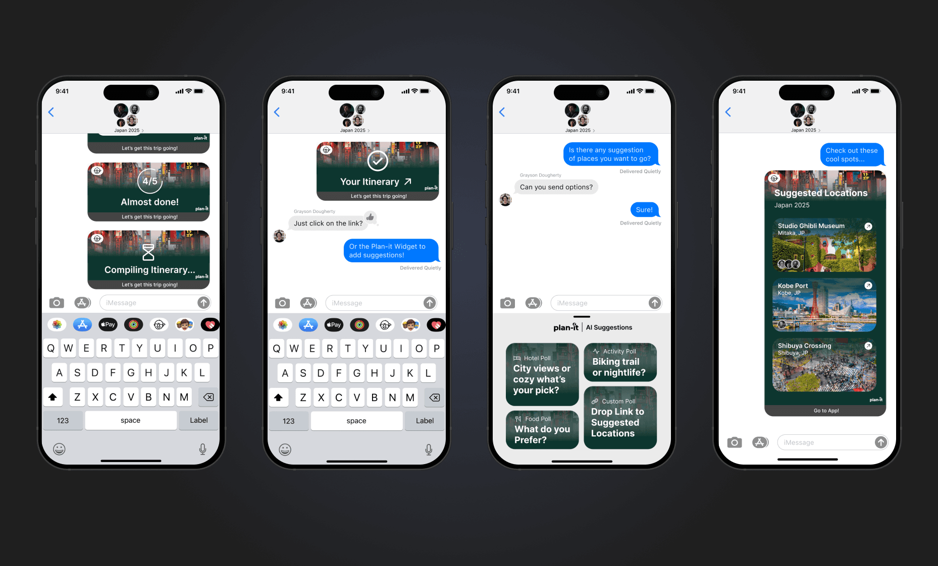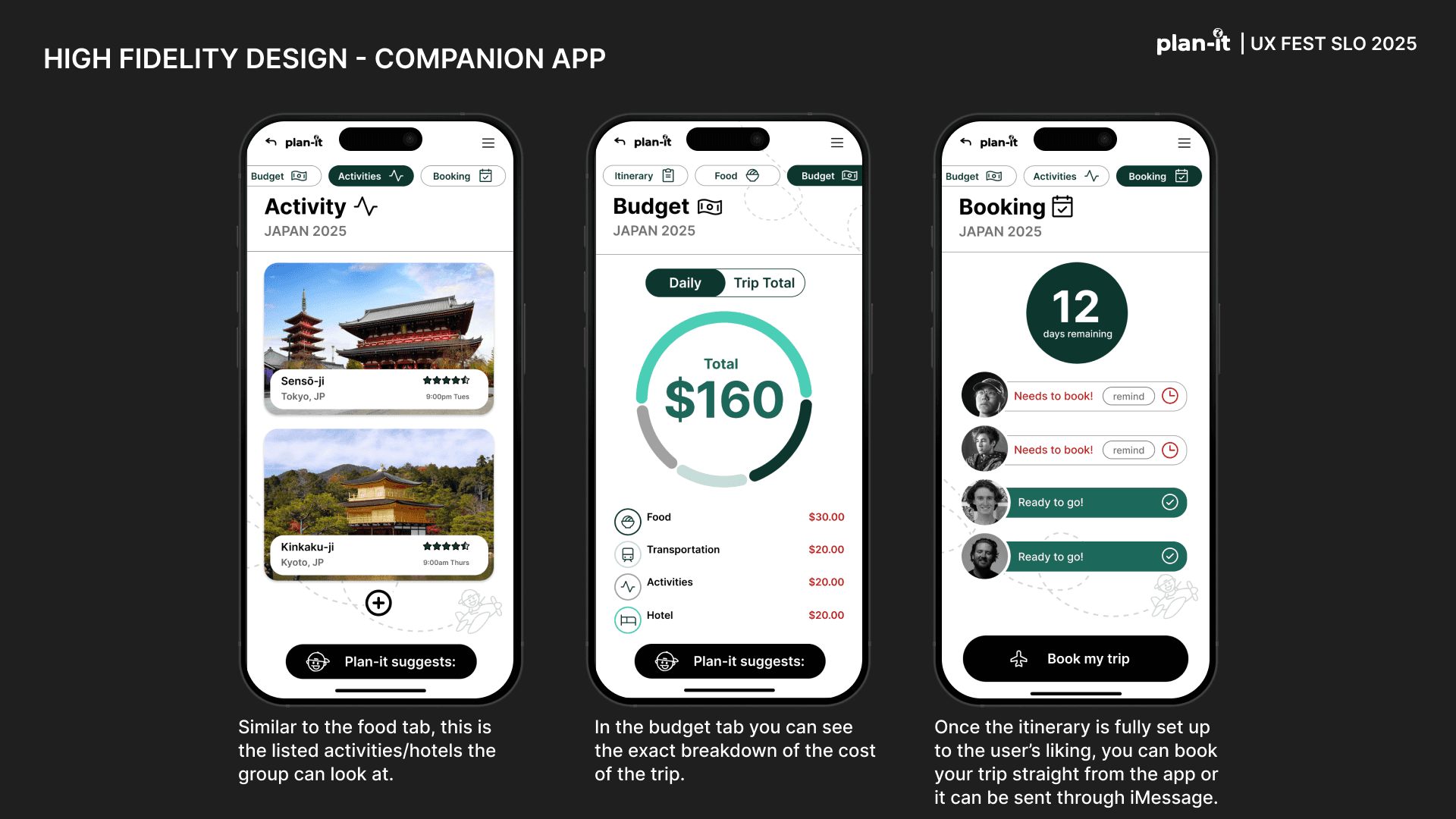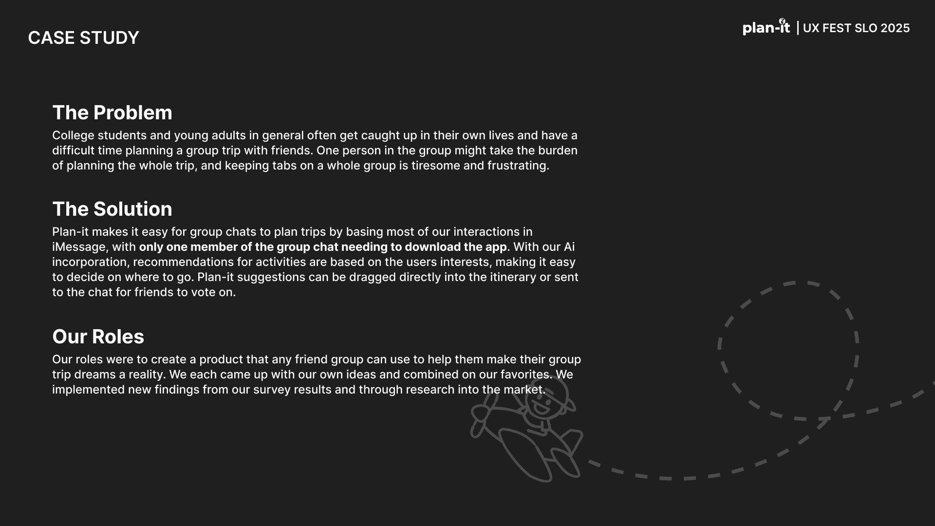 Plan-it is an original app created as part of the UX-Fest SLO 24-hour design competition, and won 2nd place out of 40+ competing teams. The prompt was to incorporate AI in an app that would help users travel from A to B. Plan-it helps groups execute travel plans in a low stress environment, embedded into iMessage.